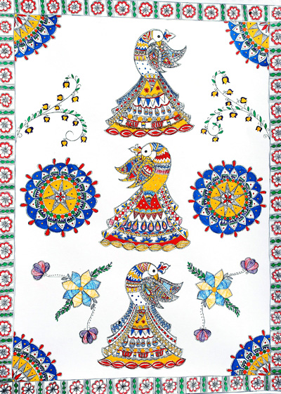 Peacock Garden by apprentice, North Indian Mithila art, 2016