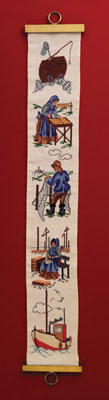 This cross-stitch illustrates various aspects of harvesting the fruits of the sea. Aline Drivdahl had reason to commemorate the Norwegian fishing trade. Her father left Norway in 1930 to seek work in Massachusetts. Like many Norwegians in the New Bedford and Fairhaven area, he found employment in the fishing industry. The cross stitch is a reminder of what brought her family here.